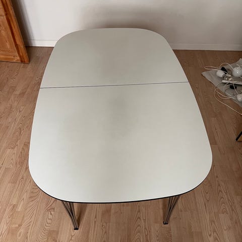 Haslev spisebord 105cm med en tillægsplade 48cm. Massiv bøg, nyslebet, står som nyt og klar til sæbebehandling eller olie. Meget velholdt…