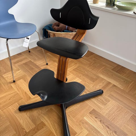 Nomi højstol (kendt som Stokke i dag) i navy plast og valnød. Højstolen har formstøbt sæde, fodplade og ryglæn samt justerbar siddehøjde og fodstøtte via beslag på træstammen. Egnet som spise- og siddeplads til børn ved bord. Overfladen på sæde og fodplade viser brugsspor og ridser, som ses på billederne.