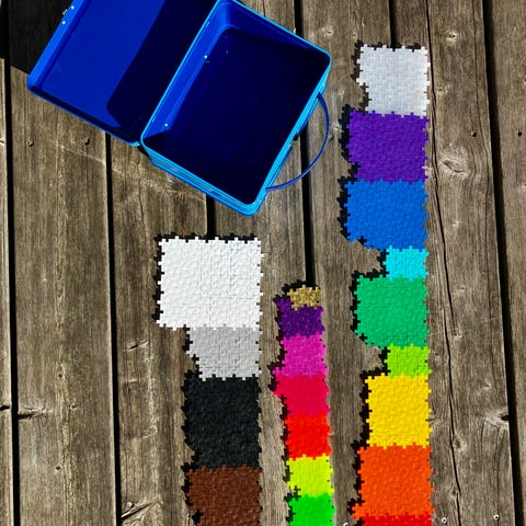 Plus Plus Glow byggesæt med brikker i forskellige farver, herunder selvlysende brikker. Sættet leveres i en plastkasse med låg og indeholder også byggeplader og en vejledningsbog med idéer til figurer. Brikkerne kan bruges til at bygge både flade mønstre og tredimensionelle figurer. Velegnet som kreativt konstruktionslegetøj til børn fra 5 år og opefter.