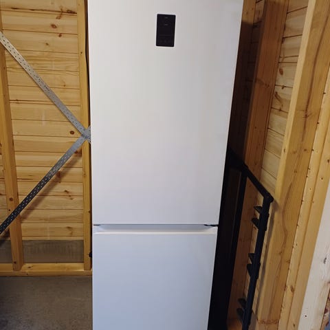 Samsung RL38T675DVW/EF køle-fryseskab i hvid med en højde på ca. 203 cm. Skabet har køl øverst og fryser nederst med flere skuffer og hylder til opbevaring. Indvendigt er der blandt andet Optimal Fresh+- og Humidity Fresh+-skuffer til opbevaring ved forskellige temperaturer og justerbar luftfugtighed. Køleskabet har all-around køling med flere dyser for jævn luftfordeling samt NoFrost-funktion i fryseren, som reducerer behovet for manuel afrimning. Modellen er udstyret med digital inverter-kompressor og har energimærke D efter den nye energiskala. Ydersiden er hvid med integreret håndtag og display i døren. BEMÆRK EN LILLE BULE I DØREN - Perfekt som ekstra køle-/fryse skab