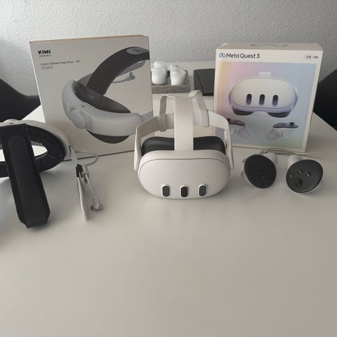 Meta Quest 3 VR-headset. Sættet omfatter VR-headset, to trådløse controllere og tilhørende kabel som vist på billederne.