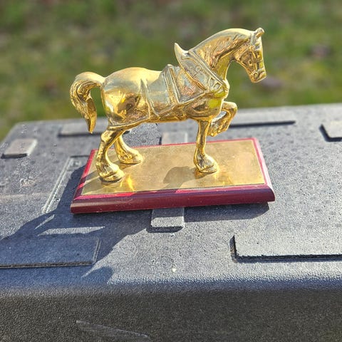 Dekorativ hestefigur i metal med indgraveret mønster. Figuren forestiller en stejlt stående hest og er udført i en mørk metalfarve med gyldne detaljer. Velegnet som pynt på hylde, kommode eller i vindueskarm i stue, entré eller kontor. Kan indgå som del af en samling af dyrefigurer eller som enkeltstående dekoration.- Det ene øre er knækket af og har ikke øret , da jeg købte den sådan , når den står mod en væg , ser man det ikke - den er tung og ca 51 cm høj- skal afhentes i Ringsted…
