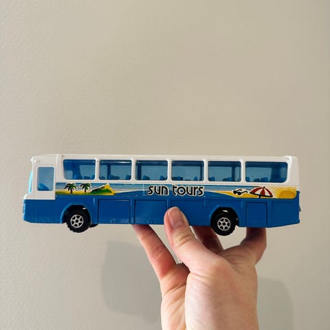 Meget gammel legetøjsbus i blik rød, gul og blå med optræk.