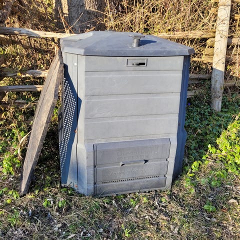 Skal afhentes i morgen tirsdag. Komposttønde med låg og bund.