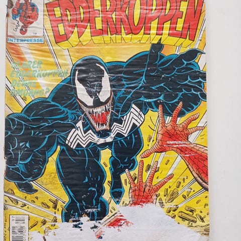 Den danske udgave af Secret Wars nr. 8, der i historiens kronologi introducerer den sorte dragt for første gang. Senere viser dragten sig så at være superskurken Venom (Krybet).
