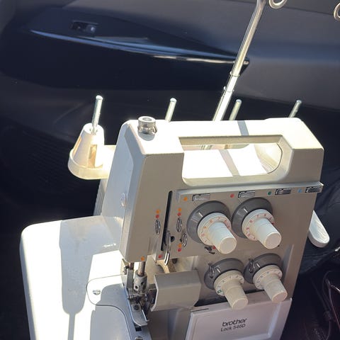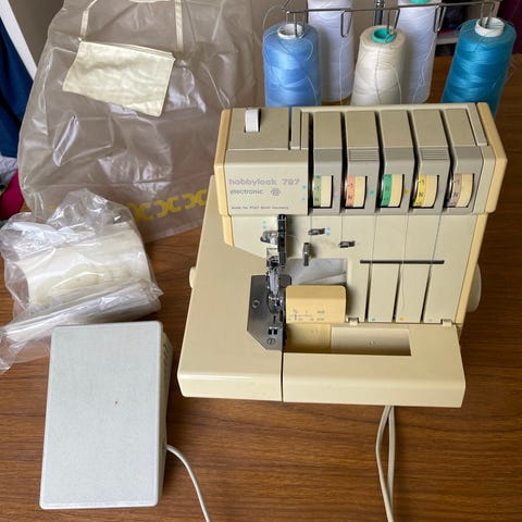Overlock i god kvalitet, velholdt med pedal, kabel, en anelse værktøj + en del ruller tråd i sort, grå, hvid, beige, rød.
