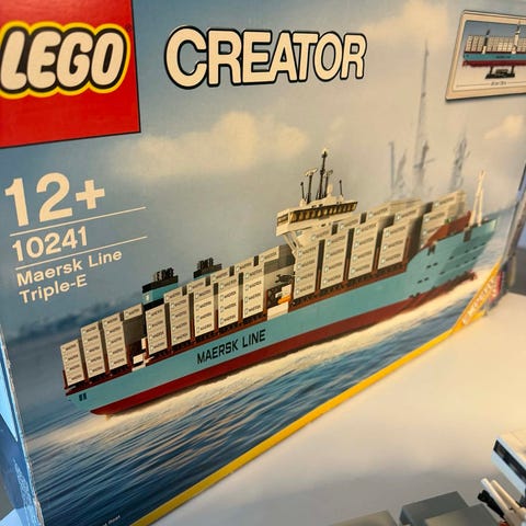 LEGO Maersk Line containerskib model. Skibet er opbygget i LEGO-klodser med aftagelige containere og detaljeret dæk. Skroget er i karakteristiske Maersk-farver med trykte Maersk-containere og maskinrumsvinduer i siden. Modellen står på en sort udstillingsstand, som gør den egnet til udstilling på hylde eller skrivebord. Egnet som samlermodel eller byggeprojekt for LEGO-interesserede.