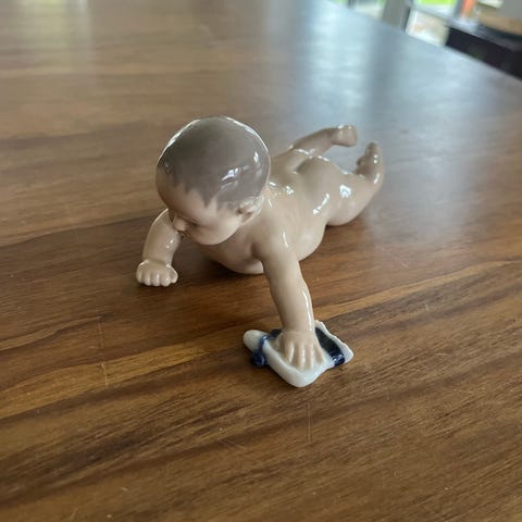 Royal Copenhagen porcelænsfigur formet som en liggenfe baby. Figuren er i glaseret porcelæn med lyse hudtoner . Undersiden er mærket med Royal Copenhagen stempel og bølgelinjer. Velegnet som samlerfigur eller dekoration i hjemmet, f.eks. på hylde, reol eller i vitrineskab.