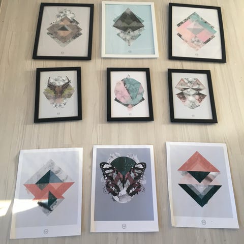 Desenio plakater og billedrammer med sort ramme. Motiverne omfatter blandt andet naturmotiver med træer og eucalyptus, modeinspirerede illustrationer samt grafiske og tekstbaserede tryk. Flere af rammerne indeholder i øjeblikket standardindlæg med teksten “Place art inside”. Velegnet til ophængning i stue, soveværelse eller gang for et enkelt, moderne udtryk.