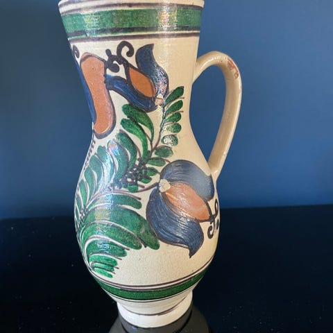 Le Vin kande i keramik i beige nuancer med brunlig glasur ved kant og hank. Kanden har påskriften "Le Vin" på forsiden og er egnet til servering af vin eller andre drikke ved borddækning. Klassisk form med bred åbning og hank for nem hældning.