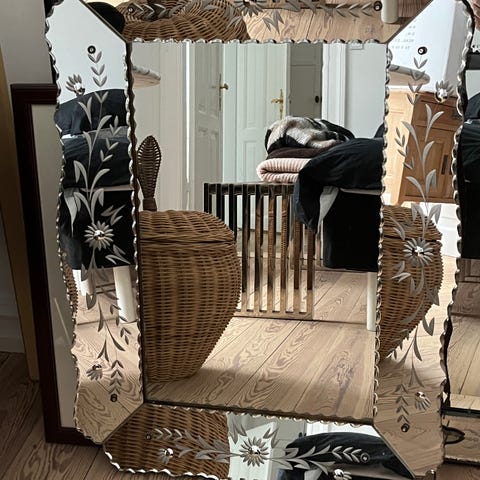 Arabia spejl med dekorativ, ornamenteret ramme. Rammen er udført i gylden farve med udskårne detaljer og farvede stenlignende dekorationer. Spejlet har en klassisk, barok-inspireret form med buet top og profilerede kanter, egnet til ophæng på væg i f.eks. stue, entré eller soveværelse.