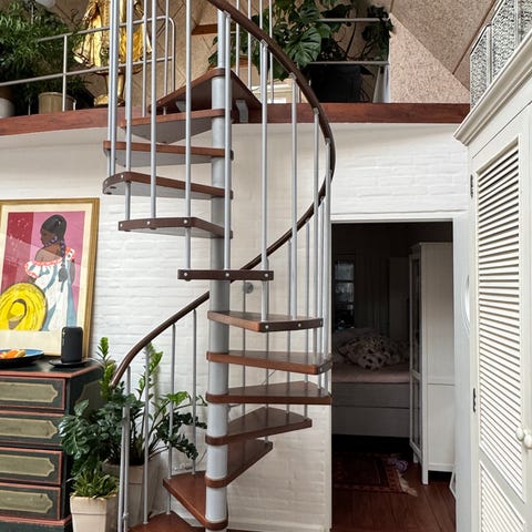 Fejlkøb - pakket ud, men ikke sat op. Spiraltrappe i metal. Trappen er udført som en klassisk vindeltrappe med rækværk og trin i metal. Egnet til montering, hvor der er behov for pladsbesparende adgang mellem etager, f.eks. i bolig, udhus eller lignende. Designet giver mulighed for lodret bevægelse på et begrænset gulvareal.
