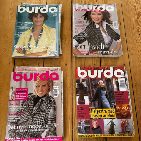 Samlet pris. 4 stk. syblade fra 90’erne.. Der medfølger mønsterark til alle blade. Du kan købe med “køb nu”, komme og hente varen tæt ved Nørrebros Runddel eller betale mig for varen og forsendelse (40 kr.) på MobilePay