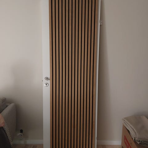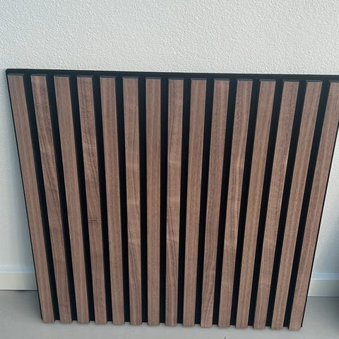 WoodUpp akustikpanel vægpanel i træ i brun tone. Panelerne består af smalle, lodrette lameller monteret på bagplade og er velegnede som dekorativ vægbeklædning med lydabsorberende egenskaber. Kan bruges i fx spisestue, stue eller kontor til at skabe et roligt visuelt udtryk og forbedre akustikken i rummet.