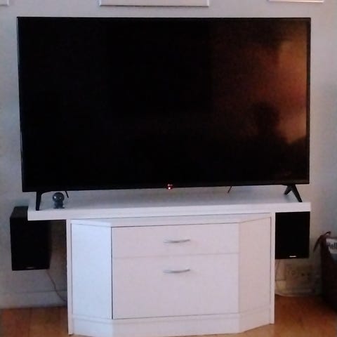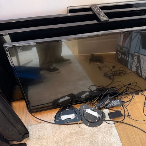 LG fladskærms tv. Tv’et har fladt panel og kan ses stående på gulv på billederne. Der er beslag indkuderet då du kan sætte det op på din væk