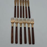 6/5 Cohr knive/gafler med elegante træhåndtag og senguldkant, perfekt til servering af ost eller tapas.