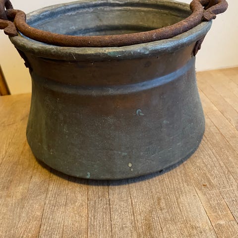 Gammel Kobberspand med kraftig jernhank og sideøjer. Spanden har tydelig patina på både inderside og yderside samt spor af tidligere brug. Velegnet som dekoration, fx i køkken, have eller som rustikt interiørelement. Materiale: kobber med jernbeslag. Ingen synlige mærker for producent eller model. H16cm D20cm