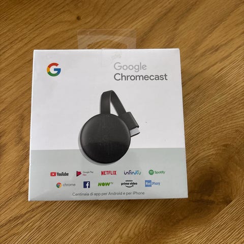 Google Chromecast med strømforsyning i sort. Enheden tilsluttes tv’et via HDMI og får strøm via medfølgende strømadapter og USB-kabel. Chromecast bruges til at streame lyd og billede trådløst fra kompatible enheder som smartphone, tablet eller computer til tv-skærmen. Velegnet til brug med understøttede streamingtjenester og apps, afhængigt af model og softwareversion.