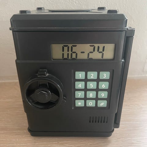 Elektronisk pengeskab med kode og digitalt display i sort plast. Forsiden har drejehjul og numerisk tastatur til indtastning af kode. Skabet har åbne-/lukkefunktion via døren foran og en sprække i toppen til indkast af mønter eller sedler. Indvendigt er der et rum til opbevaring af mindre værdigenstande eller kontanter. Egnet som sparebøsse eller simpelt opbevaringsskab i hjemmet.