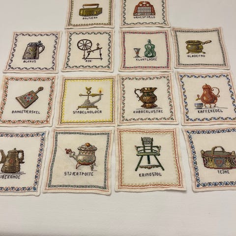 Smuk håndsyet bakkeserviet på ukendt materiale / berigefarvet.