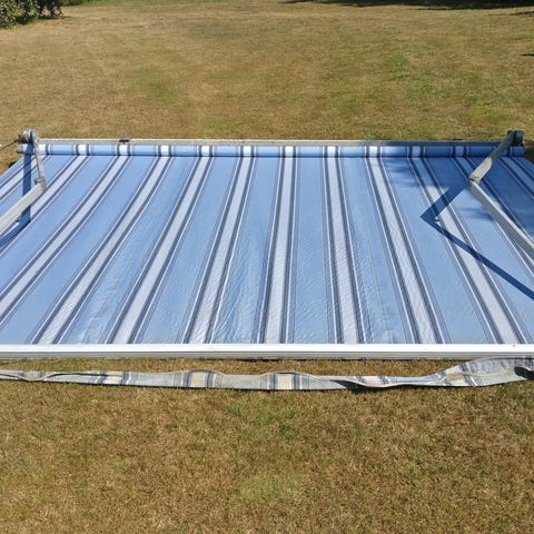 Udtrækkelig markise i grå dug, monteret på husfacade. Med håndsving