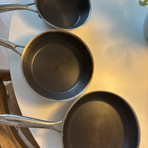 79Nord Hybrid stegepandesæt med non-stick belægning. Sættet består af tre pander i forskellige størrelser, velegnet til daglig madlavning. Panderne har hybridbelægning med mønstret overflade, der gør dem egnede til stegning med begrænset brug af fedtstof. Håndtag i metal. Kan anvendes til almindelig madlavning i køkkenet og til tilberedning af kød, grøntsager og andre retter på komfur.