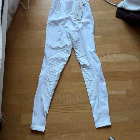 Equestrian Sports ridebukser med fuldgrip. Sættet består af et par sorte ridebukser med silikonegrip på indersiden af benene str 164, samt et par navy ridebukser med diskret logo på hoften str 152. Begge par er tætsiddende ridebukser velegnet til ridning og staldarbejde, med fokus på god bevægelsesfrihed og støtte i sadlen.