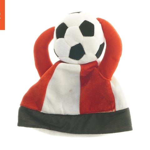 Fodboldhat i sort og hvid med mønster som en fodbold. Blød, let stofkvalitet egnet som udklædning eller til brug ved fodboldarrangementer. One size voksen/ungdom (anslået), uden angivet mærke eller materialekomposition på billederne.