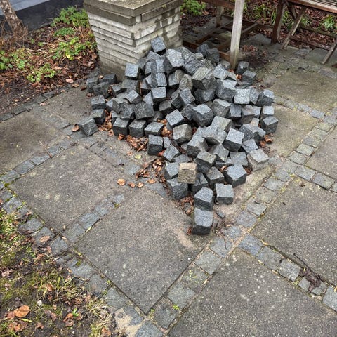Brosten og kantsten i granit i gråmixede nuancer. Stenene fremstår i forskellige størrelser og former, overvejende som kubiske brosten samt enkelte aflange kantsten. Velegnet til belægning af indkørsel, gårdhave, stier eller som kantafgrænsning i haveanlæg. Overfladen er rå og ujævn, hvilket giver et klassisk og rustikt udtryk i belægningen.