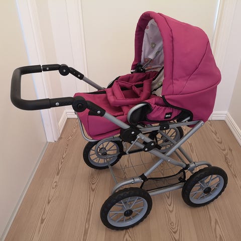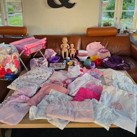 Brugt dukkevogn og dukketilbehør. Sættet omfatter en større dukkevogn med kaleche fra BRIO, flere dukker, en dukkestol, autostol og lift samt forskelligt tilbehør som dukketøj, tæpper, sutteflasker, tallerkener med mere.