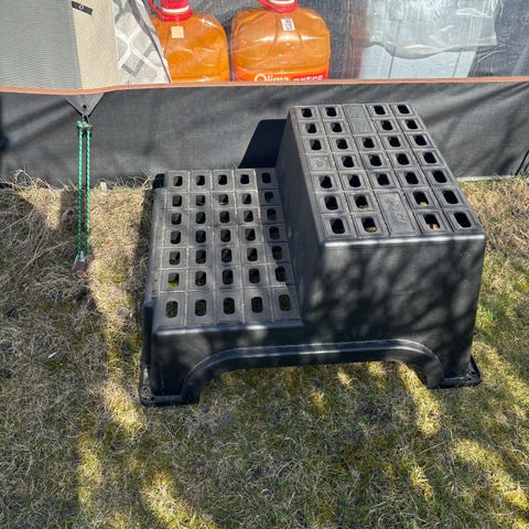 Trappe skammel i metal med to trin. Riflede trin for bedre fodfæste. Egnet som hjælp til at nå hylder, arbejde ved maskiner eller som adgangstrin i værksted, lager eller campingvogn. Er noget brugt, deraf prisen. Sendes ikke, men kan afhentes i 4772 Langebæk.