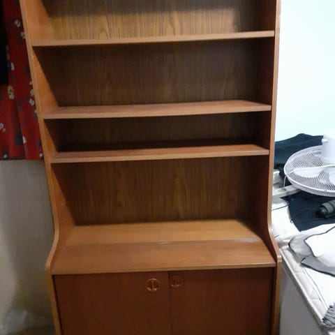 Reolen fremstår i pæn stand med almindelige brugsspor efter alder. Alle låger og skuffer fungerer som de skal. Der er god plads til både bøger, mapper, pynt, kontor eller hobbyrum.