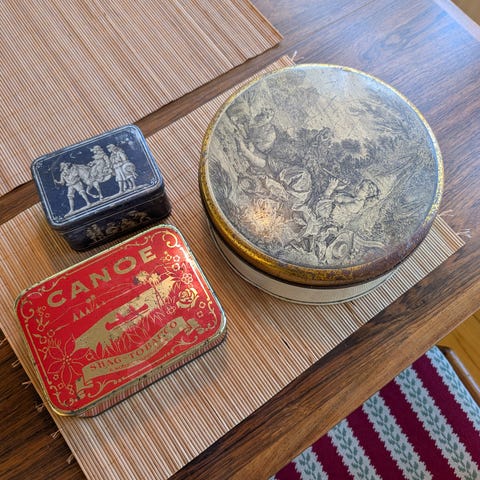 Gammel dåse med heste og kareter