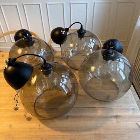 Sælger 2 flotte IKEA JAKOBSBYN lampeskærme i glas (Ø30 cm). Enkle og stilrene – passer perfekt over spisebord, køkkenø eller i stue.