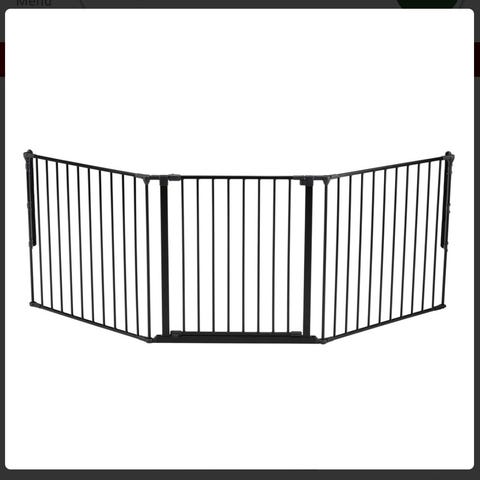 Sikkerhedsgitter i sort metal med flere sektioner, der kan vinkles efter behov. Gitteret er egnet til afskærmning ved trapper eller åbninger i hjemmet. Det består af lodrette tremmer og en sektion med åbning/låge for passage. Monteres fast på væggen i begge ender med beslag. Velegnet som sikkerhedsafskærmning til børn eller kæledyr i indendørs brug.