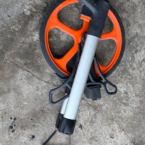 Målehjul med mekanisk tæller i meter og centimeter. Hjulet er orange med sort gummikant og monteret på et metalstel med håndtag i plast. Egnet til opmåling af afstande på fx indkørsel, have, byggeplads eller andre udendørs arealer. Tælleren nulstilles med håndtag ved siden af displayet.