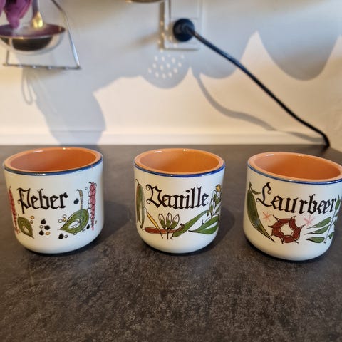 krydderikrukker i porcelæn. Sættet består af flere krukker med låg, hver dekoreret med tekst og motiv til forskellige krydderier. Krukkerne er velegnede til opbevaring af tørvarer som krydderier, urter eller andre små køkkeningredienser og kan placeres på hylde eller i skab som en del af køkkenindretningen.