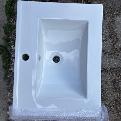 Håndvask i hvid med tilhørende kromfarvet armatur og beslag. Vasken har enkelt afløbshul i midten. Beslagene og armaturet er løse på billederne og kan monteres efter behov. Velegnet til badeværelse eller bryggers, hvor der ønskes en kompakt håndvask med standard montering.