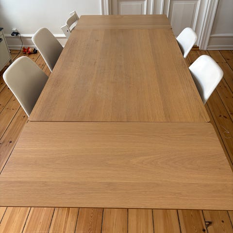 Flot og praktisk spisebord med tilhørende 4 sorte stole sælges. Perfekt til både hverdag og gæster, da bordet kan udvides efter behov.