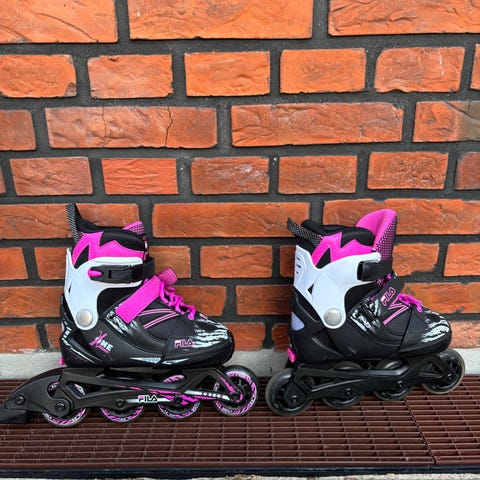 Fila rulleskøjter i børnestørrelse 32-35. Modellen har høj ankelstøtte, lukning med snørebånd, spænde og velcrostrop for stabil pasform. Velegnet til børn til brug på asfalt og andre jævne underlag.