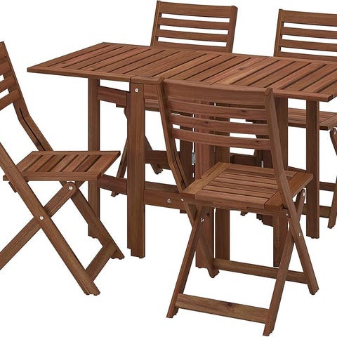 IKEA bistro sæt bestående af et klapbord og to klapstole i brunt træ.