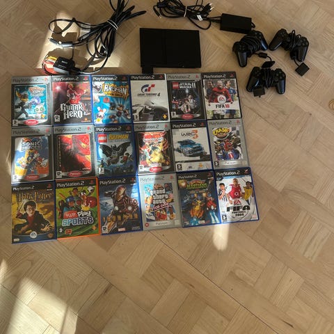 Sony Playstation 2 konsol i sort. Standard PS2 model med frontindgang til controllere og hukommelseskort samt bagtilslutninger til strøm, AV og netværk (LAN). Konsollen kan bruges til Playstation 2-spil på dvd og understøtter også lyd-cd’er og dvd-film, afhængigt af opsætning og tilbehør. Velegnet til brug med originale PS2 controllere, hukommelseskort og kompatible kabler.