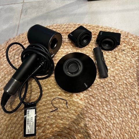 Dyson Supersonic hårtørrer i sølv. Modellen er designet med digital motor i håndtaget og et karakteristisk ringformet hoved. Hårtørreren har flere varme- og hastighedsindstillinger samt koldluftsfunktion. Sættet på billederne inkluderer flere magnetiske mundstykker til præcis styling, herunder koncentrator, diffuser og glatte-/stylingmundstykker. Velegnet til tørring og styling af forskellige hårtyper i hjemmet eller til professionel brug.