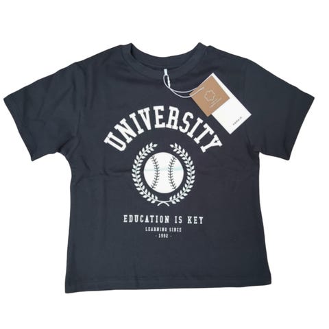 Afslappet t-shirt i en støvet blå farve og med et cool print på brystet.