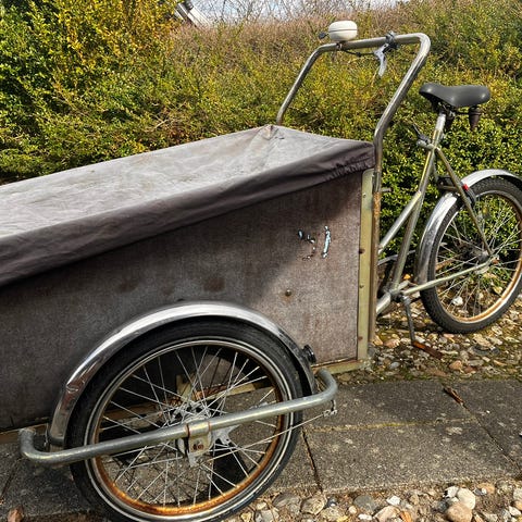 Christiania-cykel med lad sælges. Cyklen kan køre og har lås med nøgle. Den trænger dog til lidt kærlighed og småreparationer for at være helt i top.