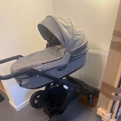 Stokke barnevognskombivogn med vendbart sæde. Vognen har højt stel med trepunktsfod og drejelige forhjul. Sædeenheden kan vendes, så barnet kan sidde både fremad- og bagudvendt. Der medfølger en ekstra tekstildel/overdel i en anden farve, som kan skiftes efter behov. Egnet til spædbørn og småbørn afhængigt af den anvendte sæde- eller liggedel.