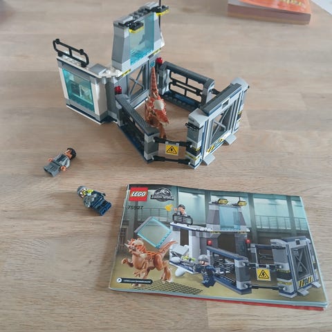 LEGO Jurassic World byggesæt med dinosaurindhegning, kontroltårn og laboratorieområde. Sættet indeholder en indhegning med porte, overvågnings- og arbejdsområde samt detaljer som vinduer og udstyr. Der medfølger mindst to minifigurer og en dinosaurfigur, som kan bruges til at genskabe scener inspireret af Jurassic World-universet eller til fri leg og opbygning i kombination med andre LEGO klodser.