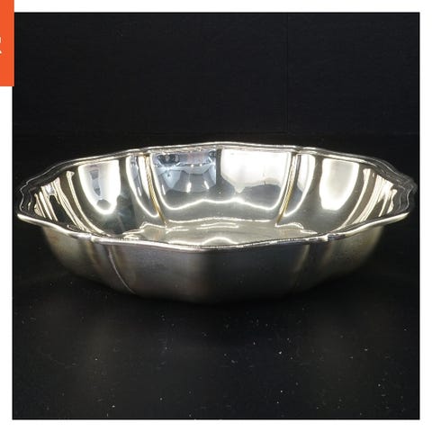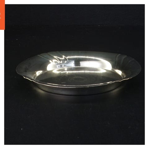 En aflang, sølvfarvet bakke med dekorative kanter. Bakken viser ridser og tegn på brug.