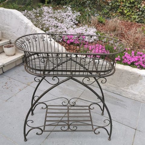 Smukke smedejern stående blomsterkurve / blomsterkørve. Potteholdere. Standende jernpiller til planter. Perfekt til hængeplanter. Settet består af 2 stående dele, en stor plantekurv og en mindre. Dimensionerne af den største stander er som følger (+/-):