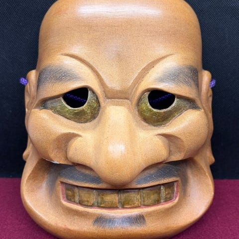 Sjælden træ Noh-maske Kurohige, håndhugget i Japan af Saikai 西海, underskrevet på bagsiden, gyldne overflade, mål 21 × 14,5 × 9 cm, dateret 1980–1990, i god stand med tegn på ældning. Klik på den blå "gå til varen" knap, for at købe eller byde på denne vare. Den samlede pris vil blive vist inden du afgiver dit bud.
